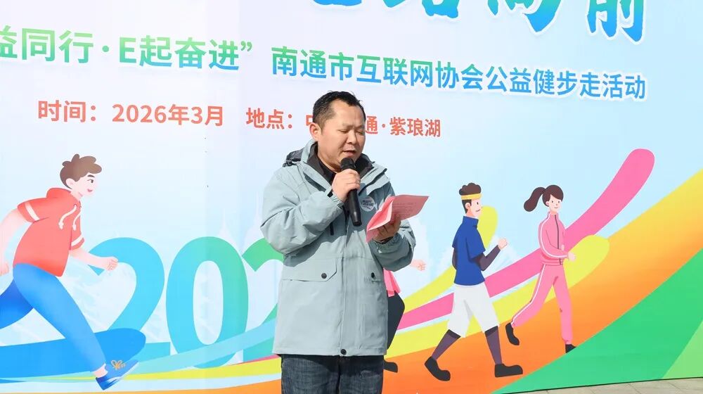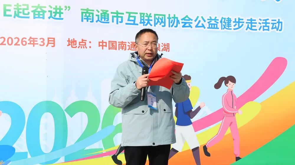 活动伊始,协会秘书长曹进忠向莅临现场的各位领导、嘉宾及参与者表示热烈欢迎,介绍了活动举办的初衷与意义。他表示,本次活动以党建为引领,将全民健身与公益传播深度融合,既是一次亲近自然、强健体魄的户外实践,更是一次凝聚行业力量、传递公益温度的生动课堂。活动旨在依托互联网行业的数字传播优势,讲好南通公益故事,彰显行业社会责任。